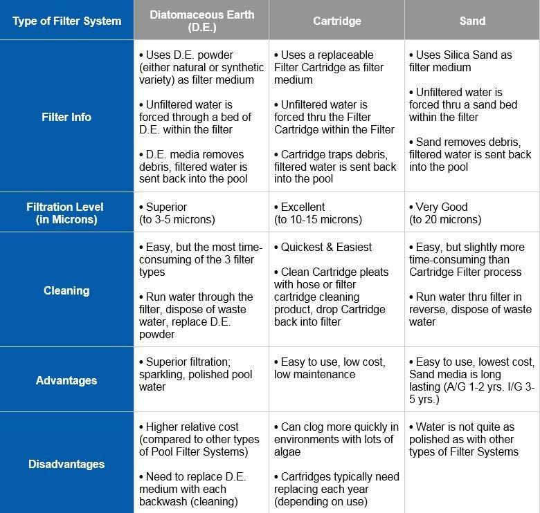 When buying an above ground pool, you’ll also have to consider purchasing a pool filter system. There are three types of filters to choose from including Diatomaceous Earth (DE), cartridge and sand filter systems. Below is information about each pool filter type along with advantages and possible disadvantages for the three types of filters.