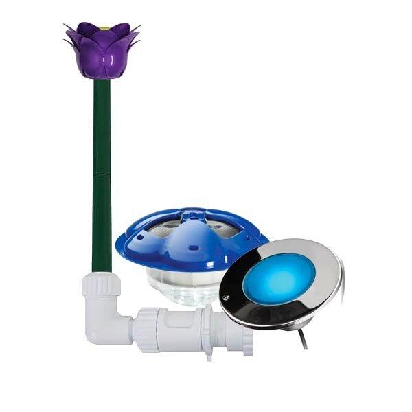 For inground pools, we have the traditional wall niche mounted pool lights, available with flood lamps or LED bulbs. LED pool lights from Hayward and Pentair are now in their 5th generation and the light produced is brighter than ever, with increased energy savings over traditional incandescent pool light bulbs. In addition, LED pool lights are available not only in Brite White, but their larger appeal is with LED color pool lights, which display dazzling light shows, or you can set it to any particular color you love. LED pool lights are so cheap to operate, you can run the pool light every night, and still pay less than using a 500W pool light once per month. Above ground pool owners love pool lights too, and we have a large selection of floating pool lights and wall mounted lights for above ground pools. The Nitelighter pool light is a standard pool lights used in above ground pools. We also have Floating LED pool lights, and the Intex magnetic LED pool light. Pool Fountains are another fun pool accessory, powered by water coming from your filter pump. Connect the pool fountain hose to your wall return for a beautiful backyard fountain.