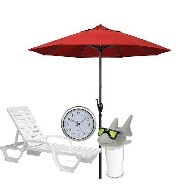 Poolside accessories are those products used around the pool like patio furniture, and accessory items like outdoor clocks and thermometers. We have both traditional bulb and digital thermometers for keeping accurate water temps. We have outdoor showers and towel racks available in this area, and a foot bath, if you’re tired of sand or grass into the pool. And although they are used in-the-pool, here’s where we keep our rather large line of chlorine floaters for pools and spas. In our Entertainment section, you can find a variety of fun items for the pool, and make your pool pop with more outdoor ambiance. Pool Furniture includes the traditional pool chaise lounges, available with vinyl straps, mesh fabric, or in molded resin. This product group also includes outdoor dining sets, Umbrellas and bases, Hammocks and chairs and Pool Stools that can be used in the pool, and on the pool deck. Protect your pool furniture during the winter with patio furniture covers, in sizes to fit chairs, tables, lounges and umbrellas too. Also related to pool furniture is our storage solutions area that has products for storing toys, floats, chemicals, even a nice looking pool side trash can or towel hamper.