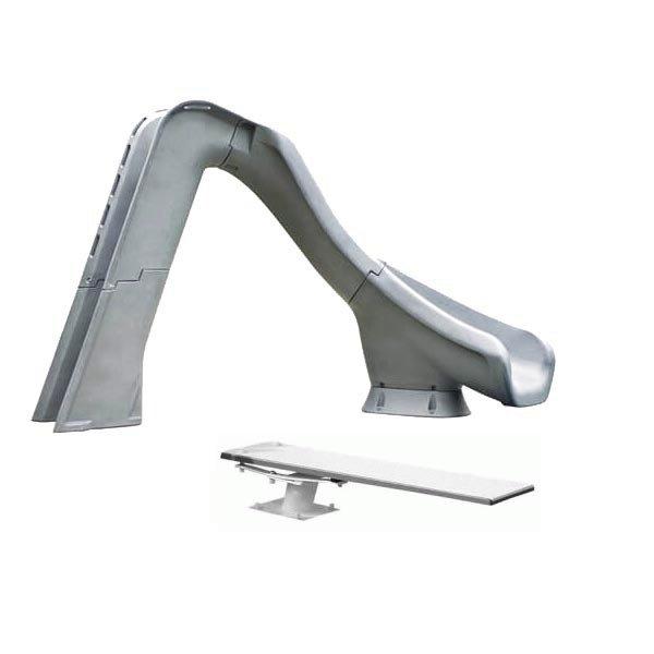 In addition to ladders and steps, Diving Boards and Slides are found in our deck equipment category. We sell complete diving boards with the base from SR Smith and Inter-Fab, and we have a large selection of replacement diving boards in 6’, 8’, 10’ sizes for residential and 14’ and 16’ commercial diving boards and stands. We also have the new Salt Pool Jump System, made entirely with corrosion-free materials to withstand salt water. For more fun pool action, we have pool slides in all sizes, from mild to wild, starting with our starter-slides, 3 models of inflatable pool slides for small children. Next largest is the Zoomerang slide, a low-profile slide that is perfect for small pools, even above ground pools. From there, the fun escalates quickly, and with slide names like Typhoon, Turbo Twister, Adrenaline and Wild Ride, your swimmers will line up for their turn. But wait, there’s more! We carry a selection of larger slides with 360° ramps; the G-Force and Helix II slides will definitely turn heads! If you really want to go big, buy the coolest pool slide in town, the Vortex commercial pool slide. Standing over 10-1/2 feet tall, and with a 20’ long runway, it may be the fastest pool slide on the market.