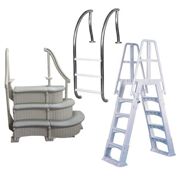 Getting in and out of your pool safely and easily is the purpose of pool ladders and drop-in pool steps. Pool ladders are available in residential and commercial models, and in stainless steel or thick ABS thermoplastic. We carry inground pool ladders and hand rails by SR Smith, Saftron, and Inter-Fab, including their new line of Designer rails and ladders. Ladders and rails have their own accessories too, such as ladder treads, escutcheon plates, anchor sockets, ladder bumpers, hardware and sacrificial anodes for salt systems. For inground pools without walk-in steps, we also have two drop-in pool step models that make entry and exit a snap. For above ground pools, we have a big selection of ladders and pool steps. Locking pool ladders and A-frame ladder systems, up to ultra-safe pool entry systems with self closing gates, which can also be combined with our pool-side decking system. Above ground steps and ladders also have their own group of accessories and replacement parts, including step pads, to protect the pool liner, removable step ballast weights, and ladder handrail deck mount anchors. We even have pool exit steps for your pets and woodland critters with the Frog Log and Pet Step.