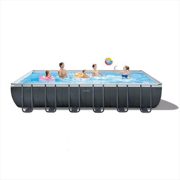 The fourth category of Intex above ground pools is comprised of Intex Rectangular Ultra Frame Pools. With respect to construction, assembly and sturdiness, these Intex pools are the same as the Round Ultra Frame Pools. However, these Intex pools provide a more traditional shape with their rectangular form and are ideal for lap swimming and playing pool games. Intex Rectangular Ultra Frame Pools are available in three sizes with the smallest measuring 18 feet by 9 feet and the largest measuring 32 feet by 16 feet.