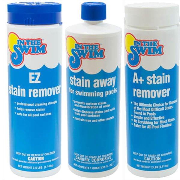Pool stains are often caused by poor water balance, in the presence of metals or minerals. To protect against these kinds of stains, use a sequestering agent like Stain Away to keep metals and minerals locked-up in solution, so they can’t come out of solution and cloud the pool, or worse, stain the pool surfaces. Other pool stains are caused by organic materials, and rust stains can occur from metal items brought into the pool. For existing stains on pool plaster, plastic steps and ladders, or in vinyl pools, we have many pool stain remover chemicals.