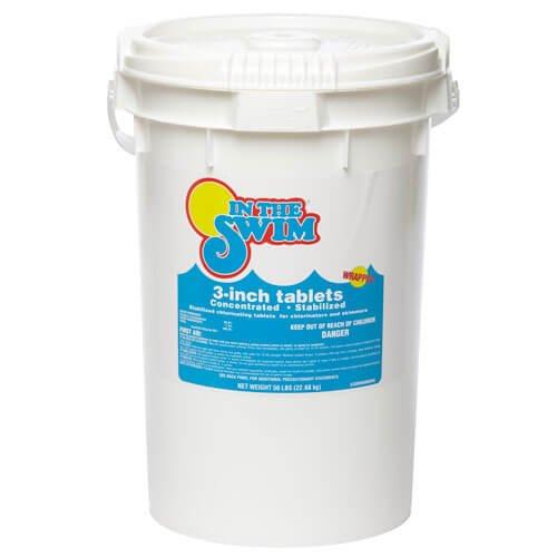 Swimming pool sanitizers include chlorine and bromine tablets, which kill bacteria and other contaminants for a healthier and cleaner swimming pool. From the day the pool is opened, you need to maintain a consistent and constant level of sanitizer in the pool, of at least 1 ppm. This is done by using tablets in a chemical feeder or chlorine floater. Bromine has advantages, and is preferred for spas, hot tubs and covered or indoor pools, but cannot be stabilized with cyanuric acid, or protected from the sun like chlorine. Chlorine tablets are available in 3 sizes; 1” tab, 3” tabs and sticks, in 10, 25, and 50 lb buckets. Most pools use about two (2) of the 3-inch chlorine tablets per week, per 10,000 gallons of pool water.