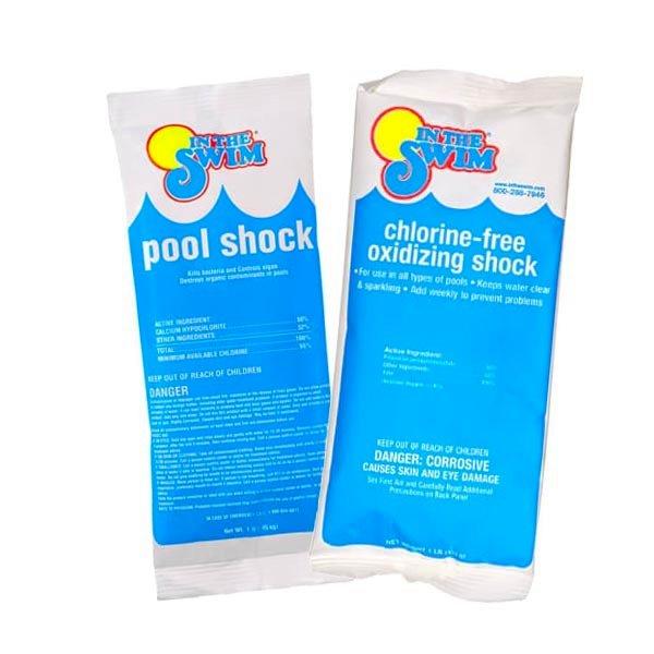 Pool Shock comes in two forms; chlorine pool shock and chlorine-free pool shock. The granular powder is used to oxidize the water and burn off impurities, remove combined chlorine molecules, and kill bacteria and algae. Use for pool openings and closing, and every 2-4 weeks during the season, to be sure the water is sanitary. Used to kill algae, bleach plaster stains, or raise low chlorine levels quickly. Chlorine pool shock is available in 3 types; as a Calcium, Lithium or Sodium based powder, in various strengths, listed as % of Available Chlorine. Pool shock is sold in 1 lb. bags, or sold loose in 25 and 50 lb. buckets.